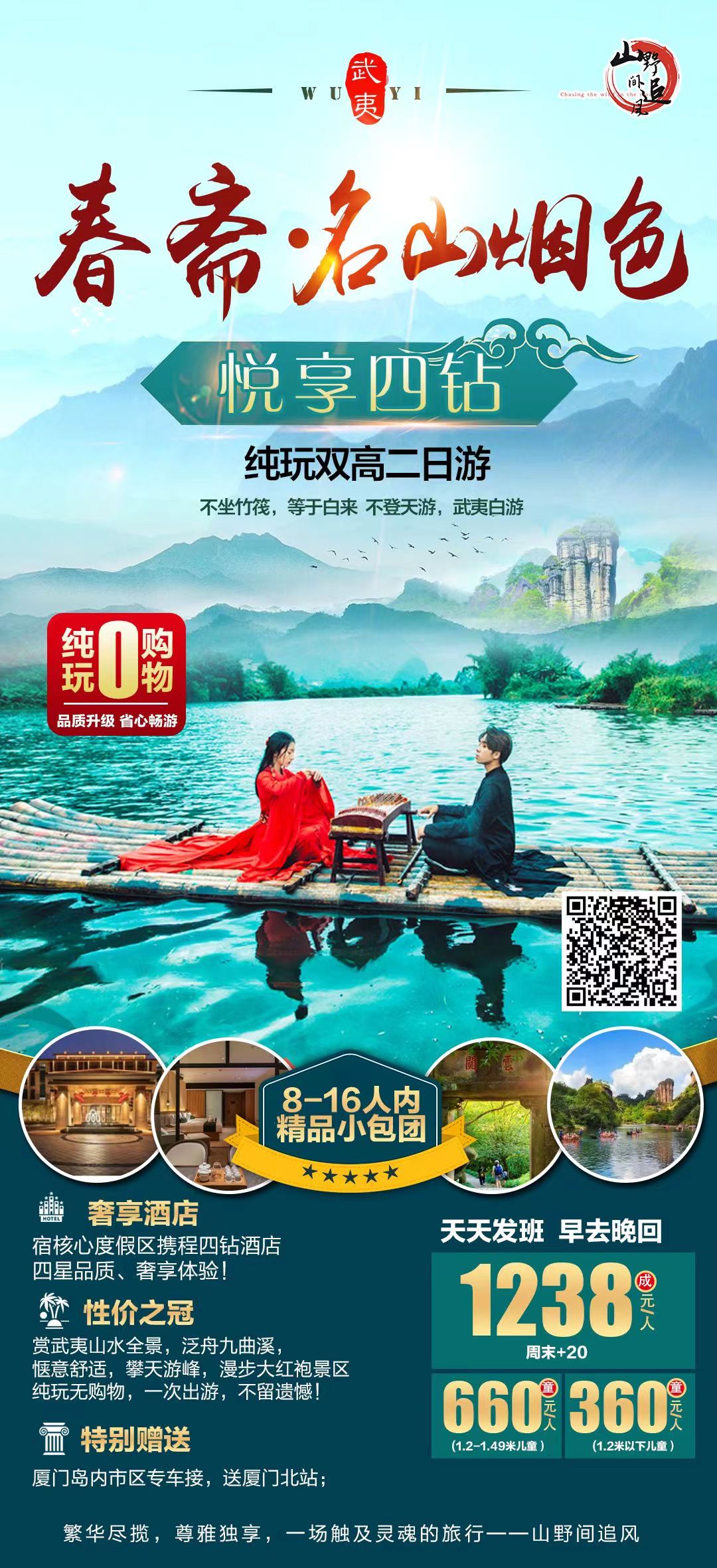 ▲因天气原因、景区人数等原因,特别是九曲溪竹排漂流的游览时间需由武夷山景区智能中心根据当地实际情况安排,旅途中可能对行程先后顺序做出调整,但不影响原定标准或减少景点。如遇人力不可抗拒因素造成行程要更改、延误、滞留或提前结束,本社负责协助解决或退还门票款,由此产生的费用自理,旅行社不负赔偿责任!