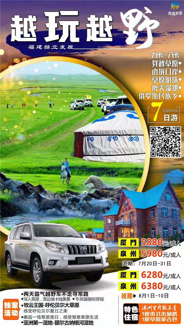 ◆ 草原的景,越野的你——【SUV 越野车集结】(4 人一车,另备司机)带领前往呼伦贝尔大草,途径呼伦贝尔景观大道,任性越野车草原深度穿越,穿越草原连绵的山坡、蜿蜒的河流、油画般湿地,穿越暮云山顶,穿越草原无人区、车轮转动在草原自然路,熙熙攘攘洁白的蒙古包,成群的牛羊,自由奔驰在草原上的骏马,不要拘束,看到美景,分享你的美好时光;