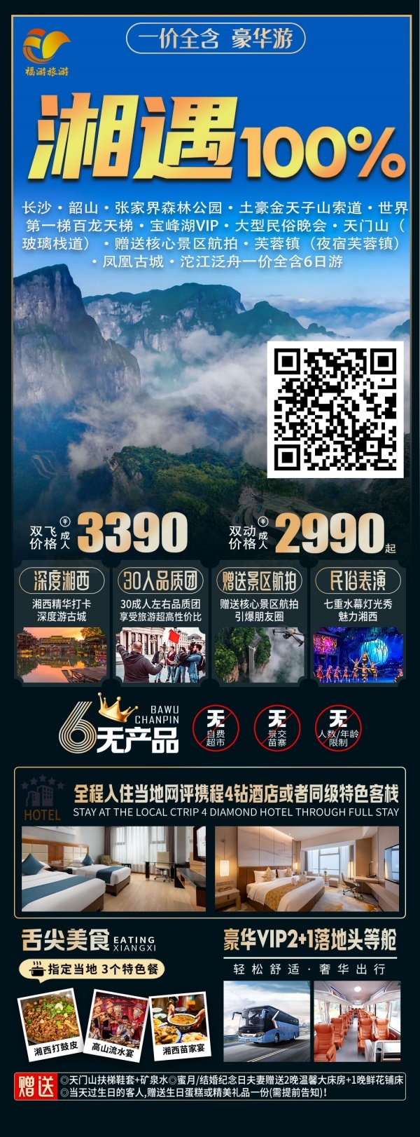 【门票】行程所列景点大门票(门票:森林公园、天门山(玻璃栈道)、魅力湘西VIP、黄龙洞VIP、凤凰古城.沱江泛舟;景区景交:韶山环保车、百龙电梯单程、天子山索道单程、天门山扶梯双程、玻璃栈道鞋套、凤凰接驳车),赠送项目不用不退,亦不做等价交换