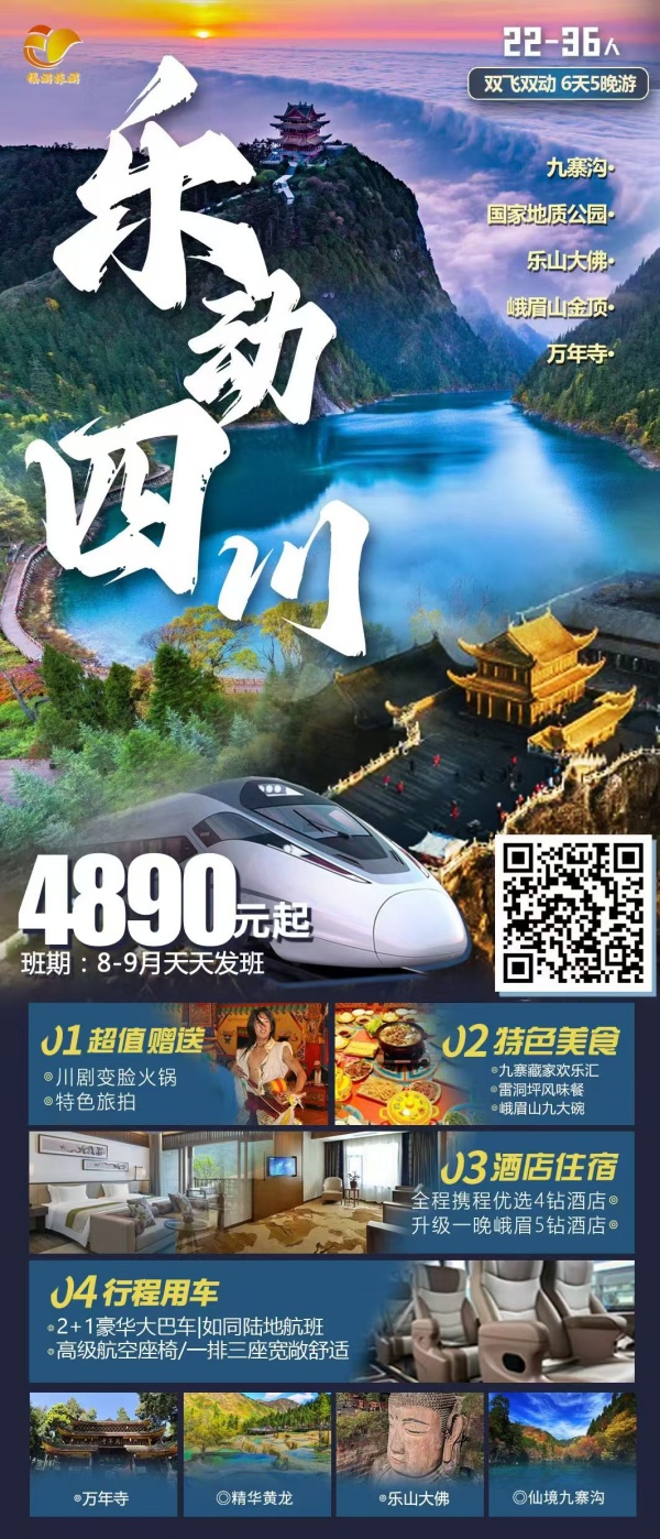 早餐后游览【万年寺景区40分钟(万年寺索道根据客人自身情况选择乘坐,旺季1.16-12.14上行65,下行45,淡季12月15日至次年1月15日上行30,下行20;万年寺小门票10元/人需自理)】万年寺,四川峨嵋山历史最悠久的古刹之一,相传为汉代采药老人蒲公礼佛处;东晋隆安五年(401)创建时名普贤寺;唐乾符三年(876)慧通重建,易名白水寺;宋称白水普贤寺;明万历二十八年(1600)重修时,神宗赐额“圣寿万年寺”,沿称至今。 午餐后游览【乐山大佛】大佛地处四川省乐山市,岷江、青衣江和大渡河三江汇流处,与乐山城隔江相望。它是依凌云山栖霞峰临江峭壁凿造的一尊大佛,建高71米,有"山是一尊佛,佛是一座山"之称,是世界上最大的石刻大佛。 后赠送游览张公桥美食街,张公桥美食街是一条独具地方特色的美食街区,整条街道采用明清仿古的建筑风格,底层为整齐划一的美食门店,集聚了富有乐山特色的钵钵鸡、麻辣烫、跷脚牛肉、甜皮鸭等菜品1千余道,街区内还经营着八大菜系的菜品200余种,获得“四川省群众喜爱产品"荣誉,徐烧烤、阙记肥店、味精素面等汇聚于此,让食客可以一站式体验乐山美食。2023年8月,张公桥美食街区成功入选四川省“蜀里安逸”消费新场景。游客可自行体验当地美食。 后乘动车前往川主寺,享用晚餐后入住酒店。