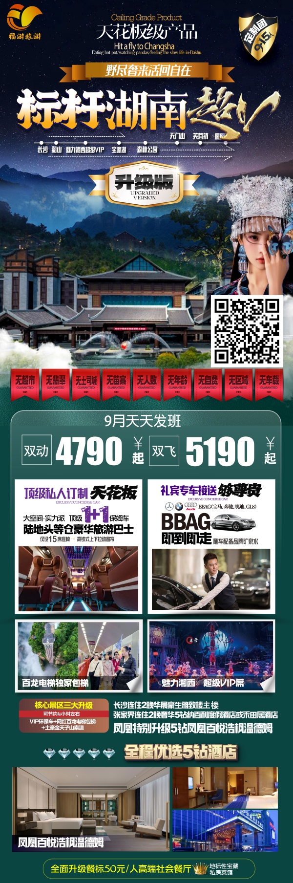 温馨提示:同一档次酒店标准,湖南当地酒店与福建等沿海地区酒店相比,有较大差异,张家界凤凰当地酒店均低一到两个档次,如有不便之处,敬请谅解