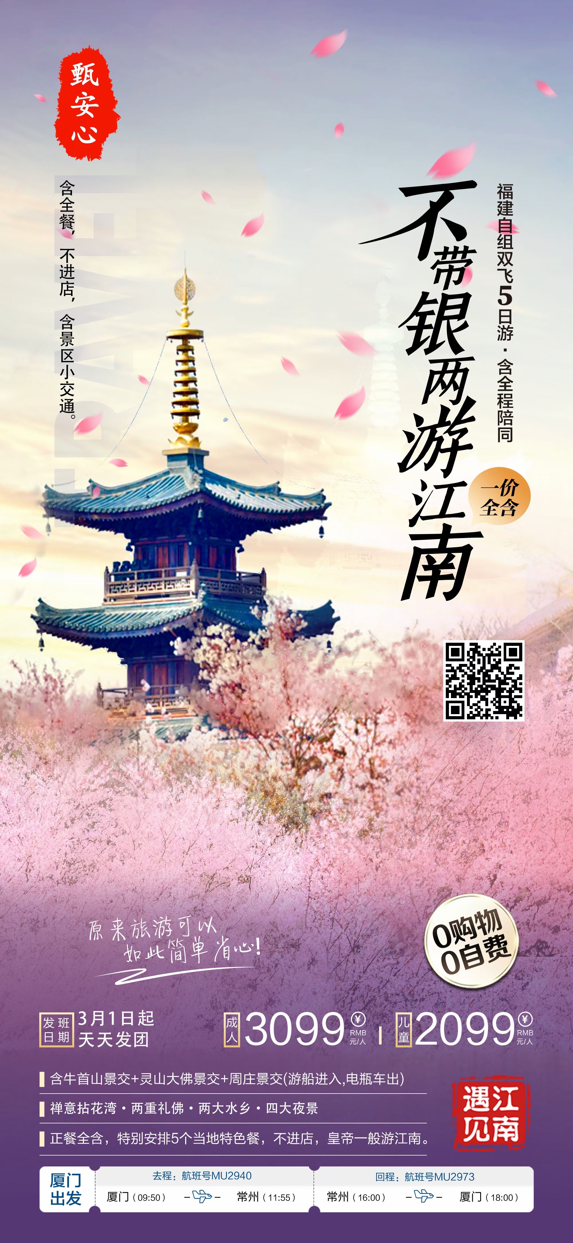 ◆厦门出发:自行抵达厦门高崎机场,乘参考航班MU2927(09:50/11:55)抵达常州奔牛机场;