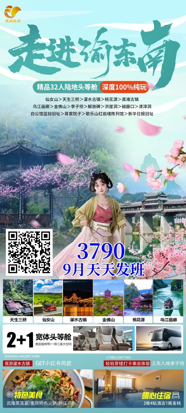 早餐后,乘车前往酉阳。 抵达后游览【桃花源】酉阳桃花源景区现为国家AAAAA旅游景区、国家森林公园,集岩溶地质奇观、秦晋农耕文化、土家民俗文化、自然生态文化于一体,浓缩了中国武陵山区美的原生态自然田园风光,传承着土家族、苗族悠久的人文历史与灿烂的民族文化。是现代人们远离尘世喧嚣、步入秦晋田园、探寻地质奇观、回归绿色天堂的理想旅游目的地。被广泛认为是陶渊明笔下《桃花源记》原型地。 后乘车前往龚滩古镇,船游乌江:【龚滩古镇】“龚滩一梦,情醉千年”,龚滩古镇源自蜀汉,置建于唐,历经 1800 年历史风霜,是吴冠中老先生口中爷爷奶奶的家。特色吊脚楼与碧水乌江构成一幅千里江山图,被誉为“乌江画廊核心景区和璀璨明珠”【乌江画廊】乌江画廊两岸翠绿葱郁,山峦叠嶂,奇峰对峙,各显神姿,奇山、怪石、碧水、险滩、古镇、廊桥、纤道等构成了乌江百里画廊的景观要素,乘坐乌江画舫,便可观赏美不胜收的景致。