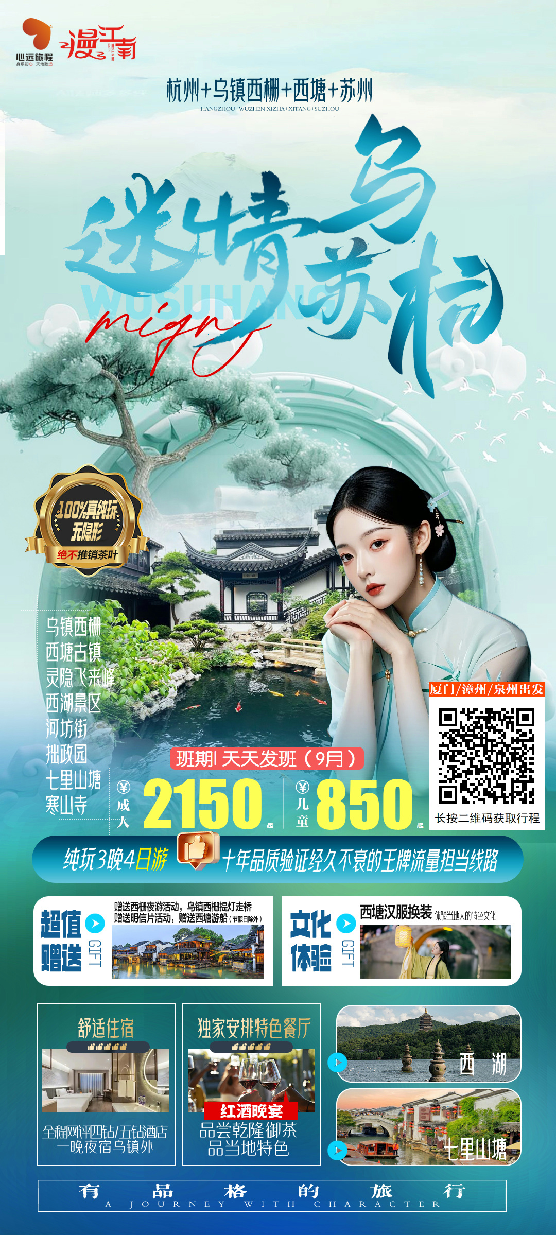 备注:(乌镇内1.5米以上的小孩必须占床,酒店会查标间内入住二成人以上,若有此情况会重罚,请提前说明)。如当地拼住或安排三人间或加床,单间差当地现退,一般加床为钢丝床)若全程需要大床房,因有差价,需提前咨询。