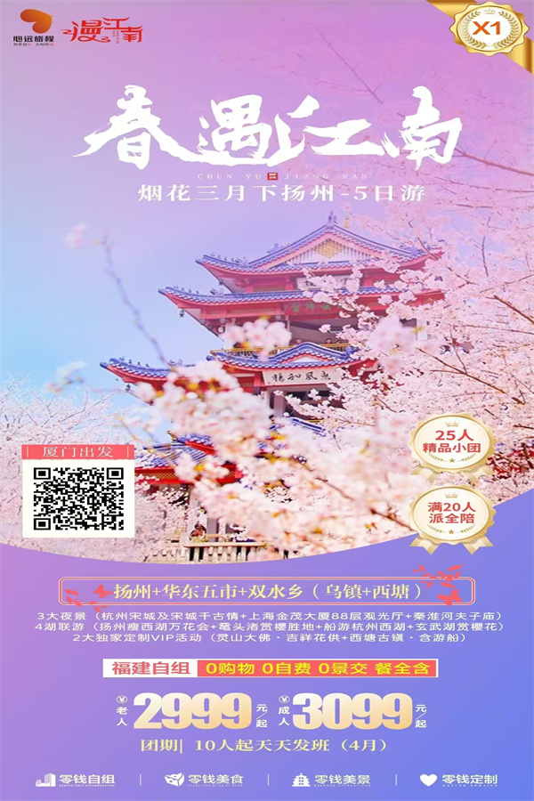 ▶ 游览:“两岸花柳全依水,一路楼台直到山”的著名湖上园林【瘦西湖万花汇】(游览时间不少于1.5H)窈窕曲折的湖道,串以长月茶楼、湖滨长廊、石壁流淙、静香书屋等两岸景点,俨然一幅天然秀美的国画长卷。 游览:【万花园】万花园最佳赏园时间为3月至5月上旬,扬州独一的琼花、芍药正开得旺盛。踏进万花园,展眼尽是大大小小的花木圃,就连道旁岸边、屋前宅后都插植花木苗。木本的、草本的、爬藤类的、阴生植物,立植、盆栽各具形态,枝叶摇曳生姿,秀色宜人。