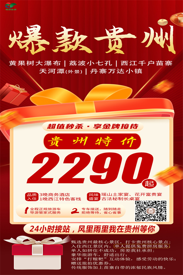 3、门票:所列景点首道门票,黄果树门票、小七孔门票、西江千户苗寨门票。(已将相关景点进行优惠打包,成本均为按照景区给予旅行社优惠价核算,因此不再重复享受景区挂牌优惠。)