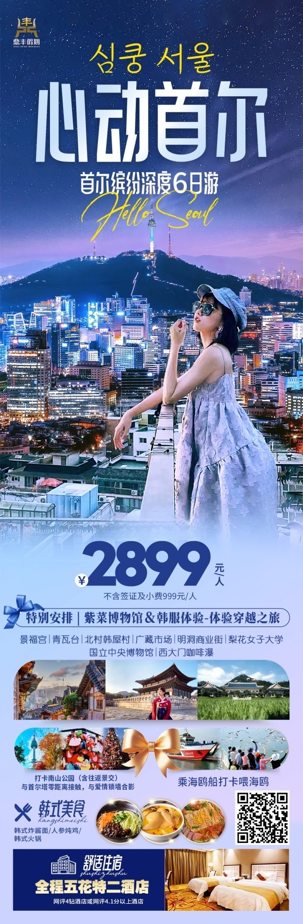 2)住宿:全程五花特二。(韩国无星级制度,网评4钻,或网评4.1分以上 )(以两人住宿一间标准房为基准,如旺季期间所安排酒店标间爆满,会自动提升全单间),如需一人住一房需补单间差(单间为标准单人房单间,而非标准双人房单人用)