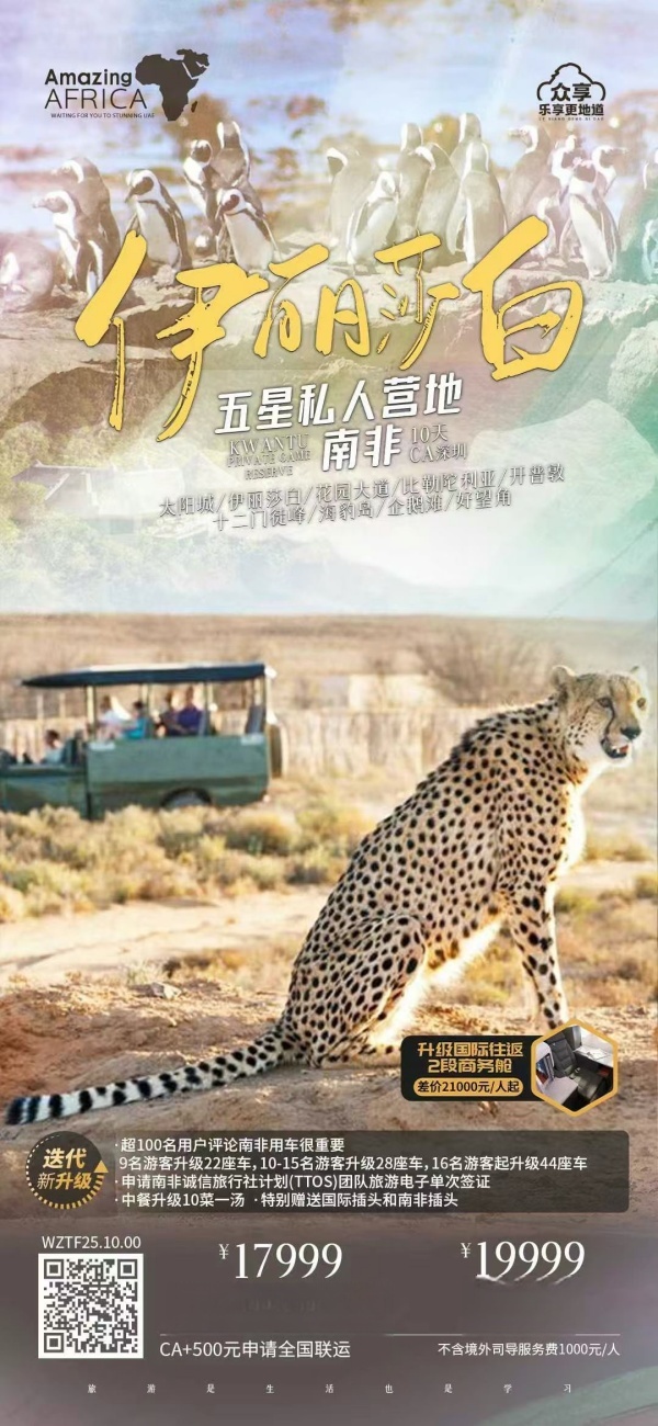 上午:早餐后前往伊丽莎白【五星私人营地】午餐后入住酒店休息下午:抵达后,乘坐酒店提供的越野车进行 Safari.【Kwantu Private Game Lodge 独家伊丽莎白五星私人营地追逐动物之旅】营地为您提供从五大非洲冒险到五星级酒店的想象力的盛宴,这个神奇迷人的地方由英国定居者建造拥有丰富的野生动物种群。享受轻松的住宿,享受完全的宁静和隐私,在参观野生动物保护区时,Halaal Afro-Asian 传统美食带有一丝香料是必不可少的。野生动物保护区越野车 safari,包括追逐非洲五霸以及保护区内丰富的野生动物,鸟类和植物。在 safari 过程中,通过野生动物及其经历的故事启发您,让您留下非洲风情美好回忆。(safari 活动由酒店提供,一切以酒店安排为准)
