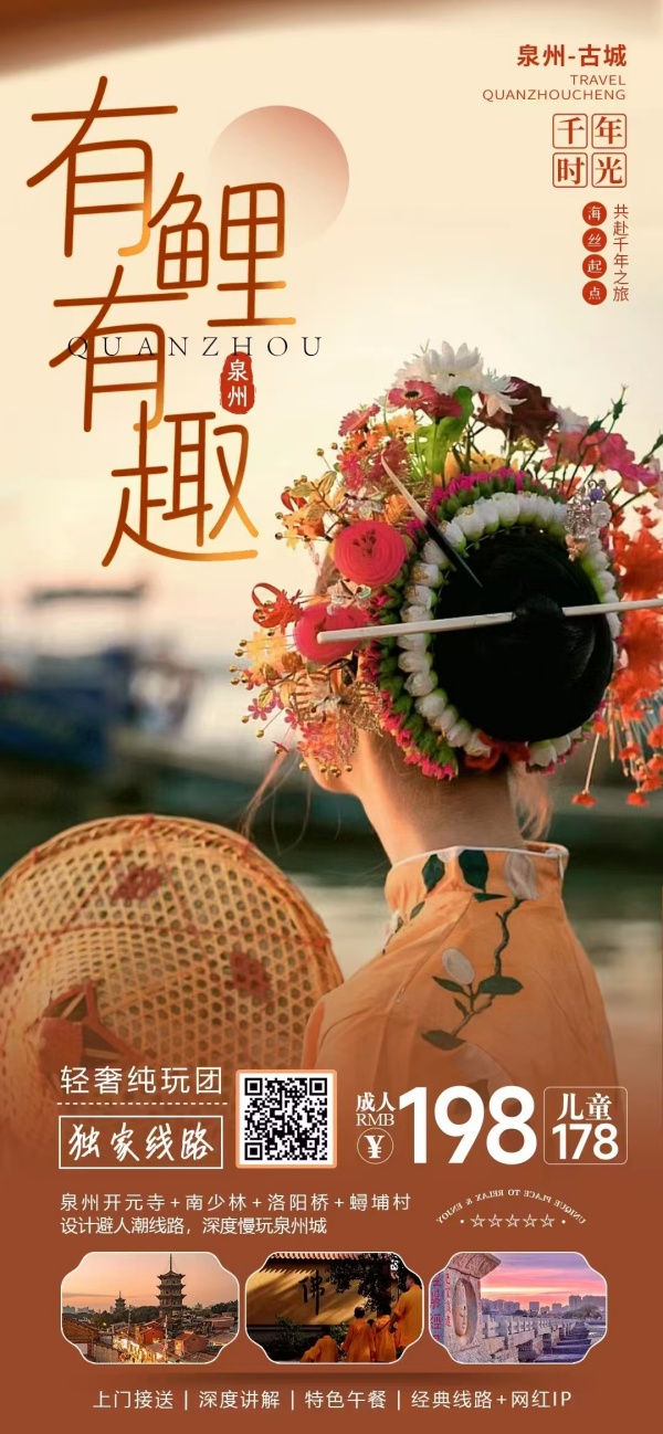 【15:00】前往浔埔村,蟳埔村位于福建省泉州市丰泽区东海社区的一条小渔村,这里居住的是古时阿拉伯人的后裔。这里的女人们头上戴着鲜花做的漂亮的簪花围,戴着丁香耳坠,穿着大裾衫、宽脚裤,形成了一道独特的风情,她们和惠安女、湄州女一起并称福建三大渔女,这里还有别具特色的民居“蚵壳厝”。体验浔埔村地方民俗,风土人情。【插花自理】